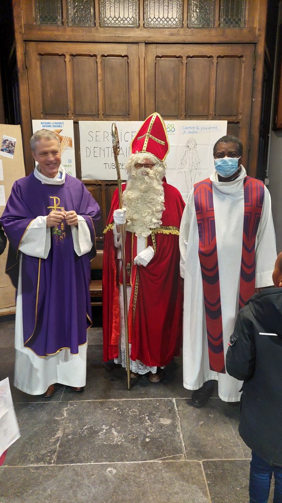 Ce dimanche 5 décembre, avec un jour d’avance, nous avons eu la surprise et le bonheur d’avoir en fin d’eucharistie la visite de Saint-Nicolas. Merci à lui de nous avoir rendu visite, merci aux prêtres qui nous ont donnés ce moment de rêve et merci de voir briller dans les yeux des enfants présents cette magie qui a bercé notre enfance. Merci St Nicolas de nous avoir donné des moments de rêves en ces temps d’anxiété que nous vivons.
